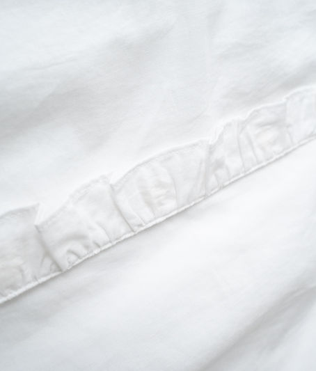 バンドカラーに前立てフリルを挟み込み、甘さを抑えた上品なアクセントをプラスしました。